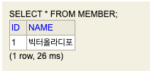 create-drop으로 해줬기 때문에 member테이블이 없어도 자동으로 생성! @Getter는 롬복을 이용해getter메서드를 생성한 것@NoArgsContructor는 기본 생성자(빈 생성자)를 자동으로 생성해주는데, 접근제한자를protected로 설정한다@Id는 테이블의 primary key 컬럼과 매핑된다@GeneratedValue는 pk생성 규칙을 설정한 것인데 기본값은AUTO이다