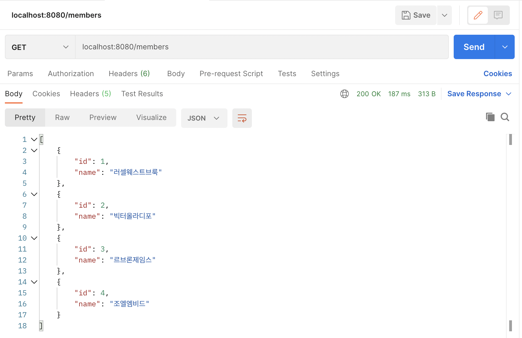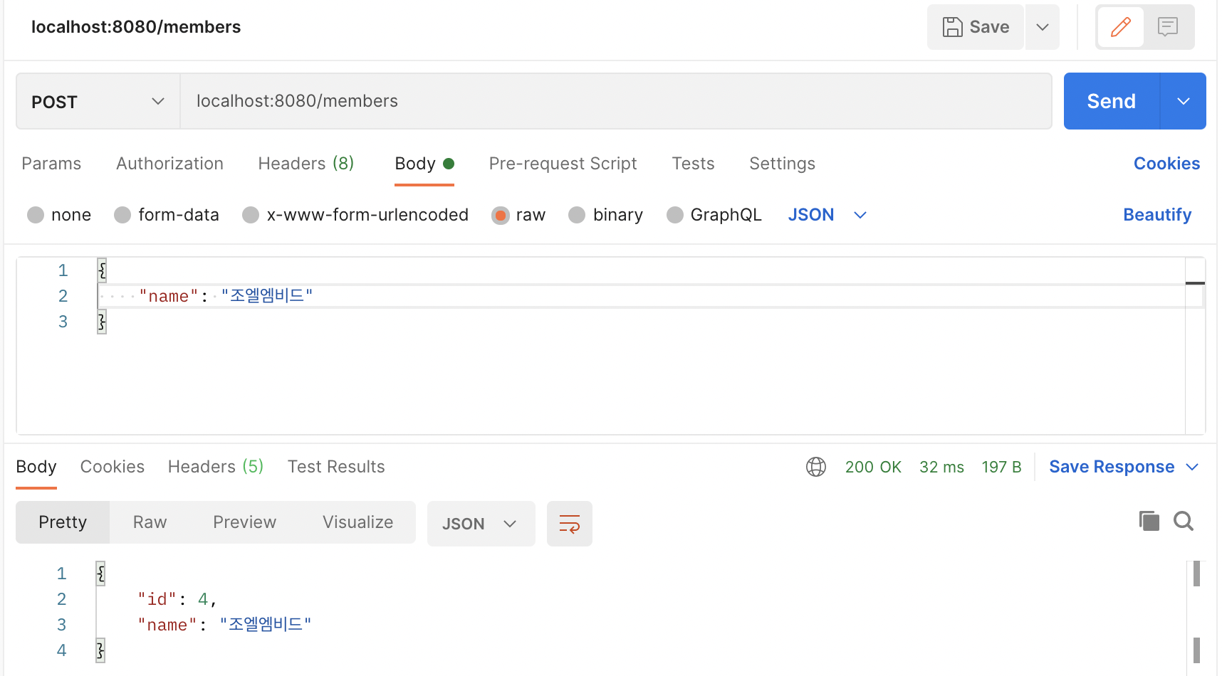 }이름만 보냈고, 성공해서 결과값으로 저장한 값이 왔다.