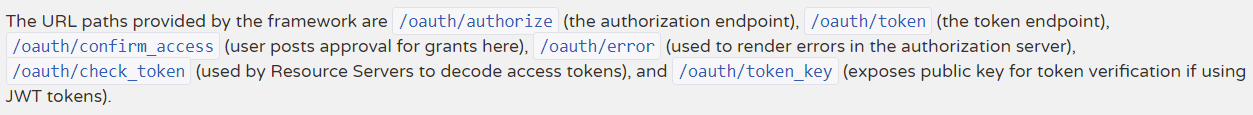 /oauth/token 과 /oauth/authorize를 포함한 여러 endpoints가 자동으로 생성 됨 (아래 참고)