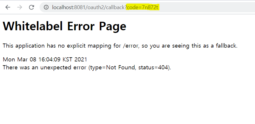 현재 RedirectURI에 맞는 코드를 작성하지 않은 상태라 404에러가 뜬다.